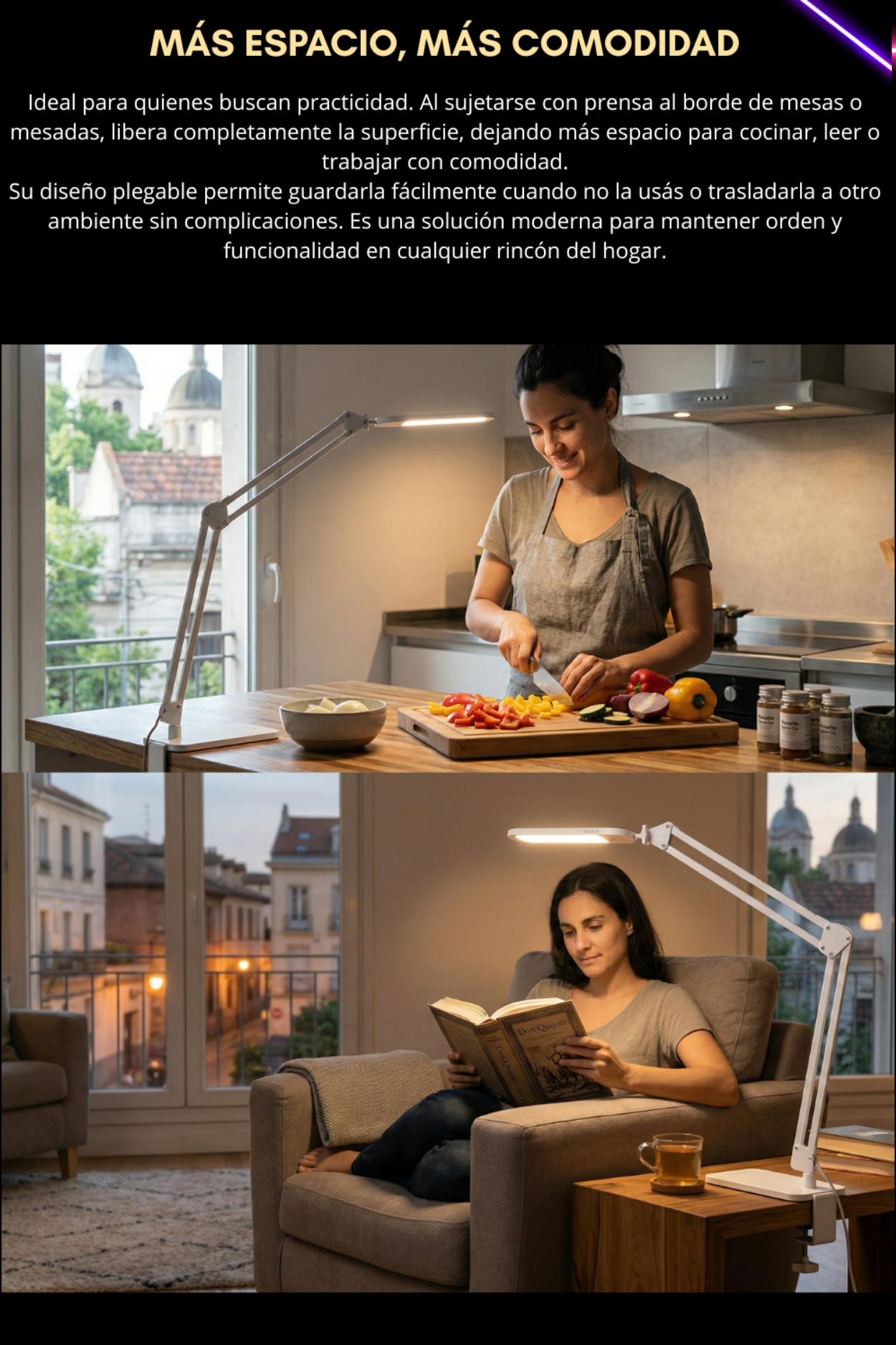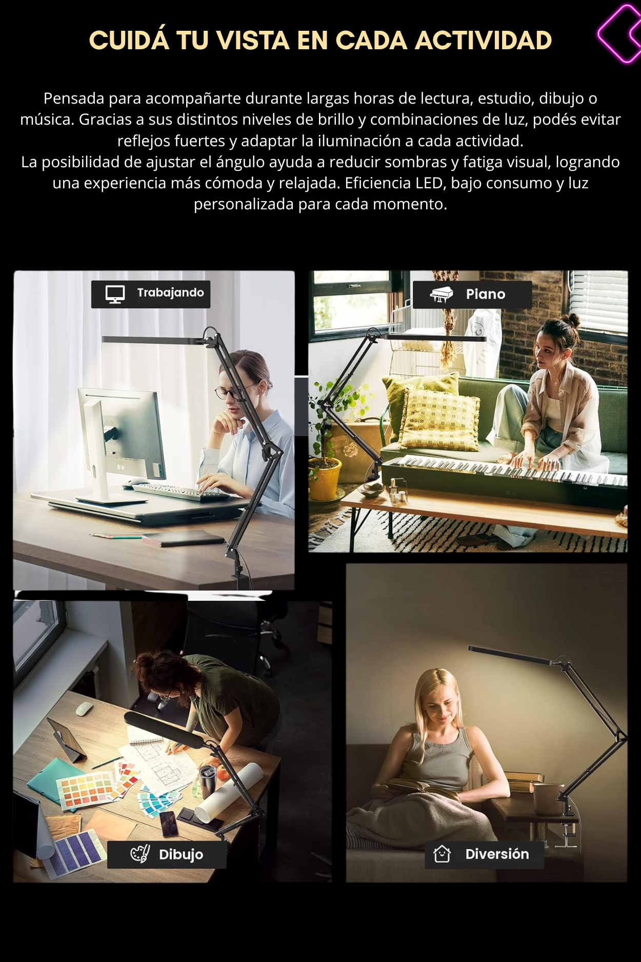 Sí. Una buena iluminación reduce el esfuerzo visual cuando trabajás en la computadora, estudiás o leés. Al poder colocarla a la altura adecuada y regular tanto el tono como la intensidad, ayuda a disminuir el contraste excesivo entre la pantalla y el ambiente oscuro.