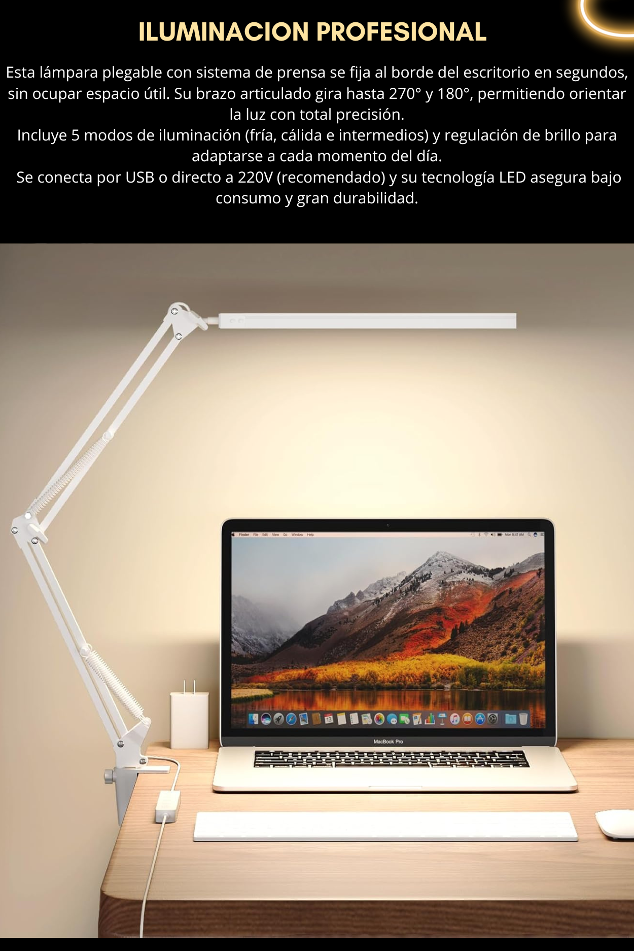Cuenta con 5 modos de luz que combinan tonos fríos, cálidos e intermedios. Además, permite regular la intensidad de brillo, para adaptar la iluminación según la actividad o el momento del día.