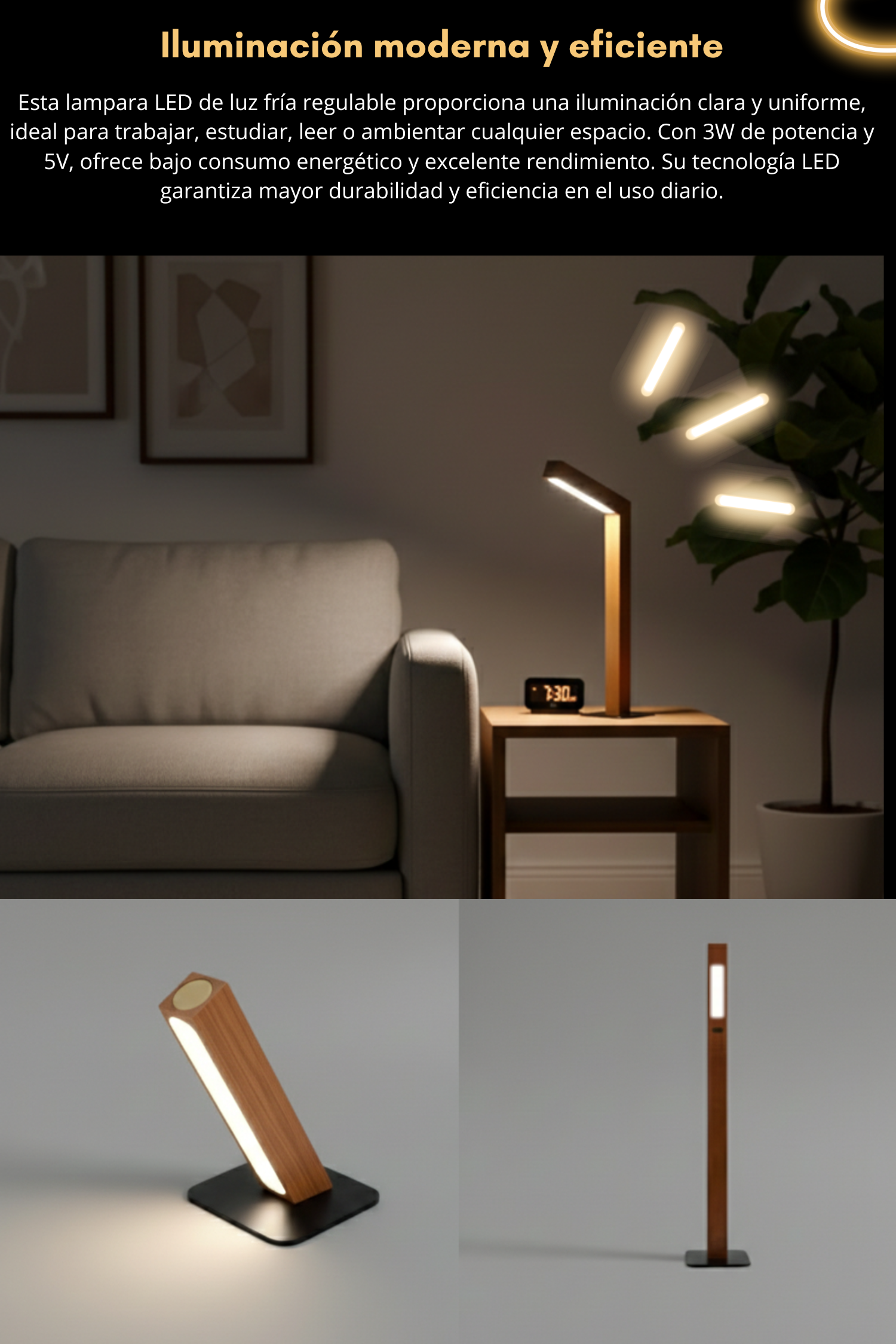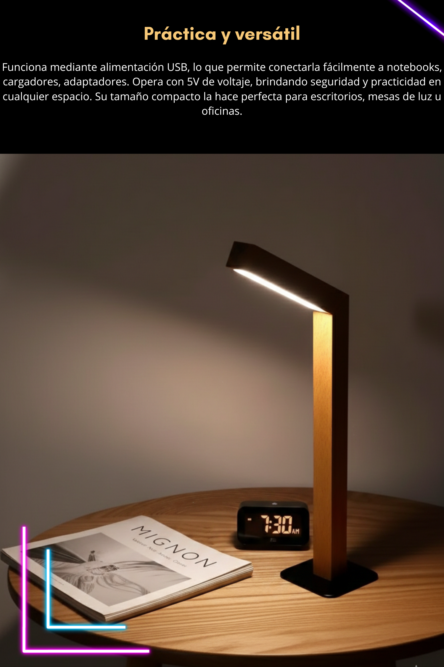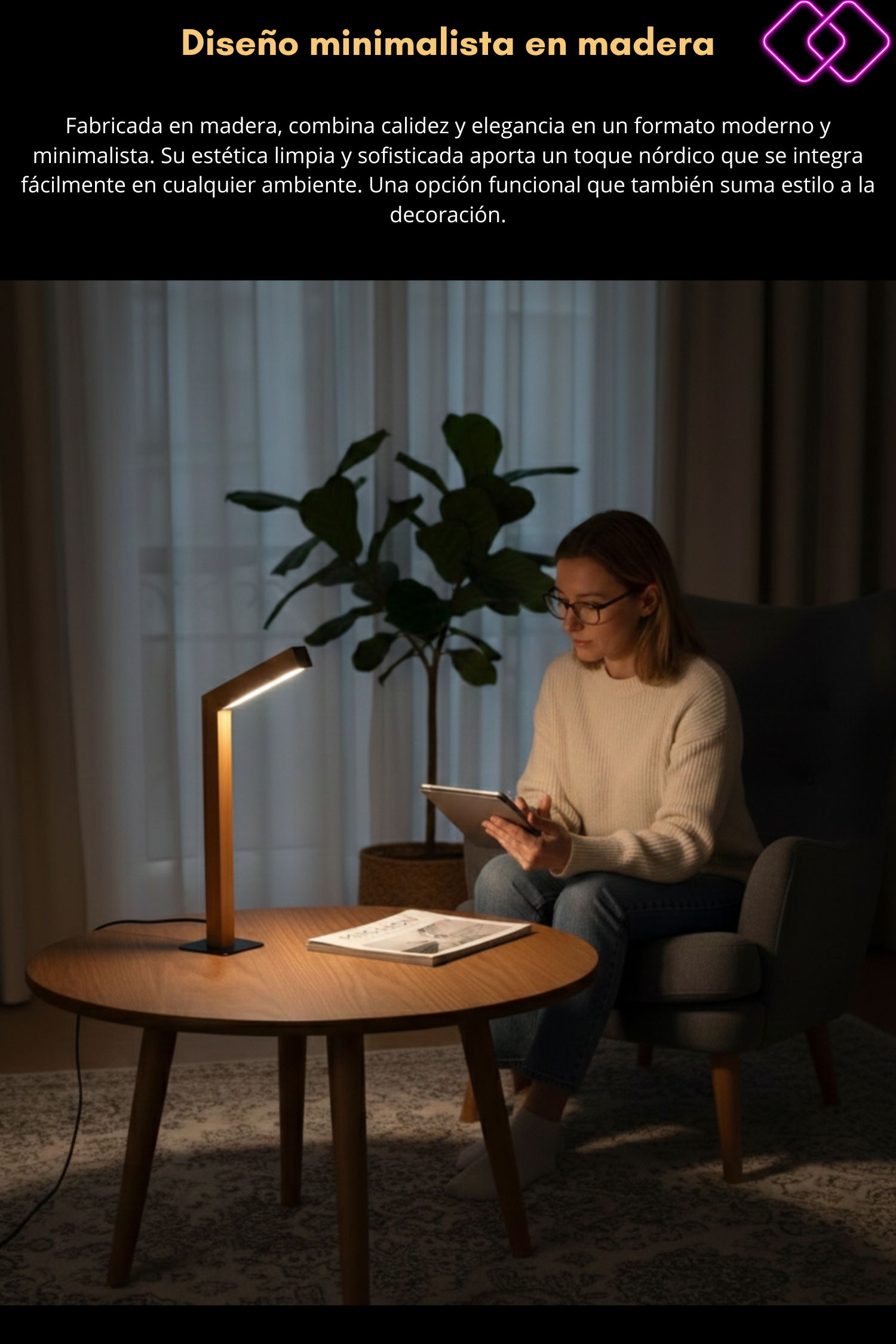 Está fabricada en madera, lo que le da un diseño moderno, minimalista y elegante que combina perfectamente con escritorios, mesas de luz u oficinas.